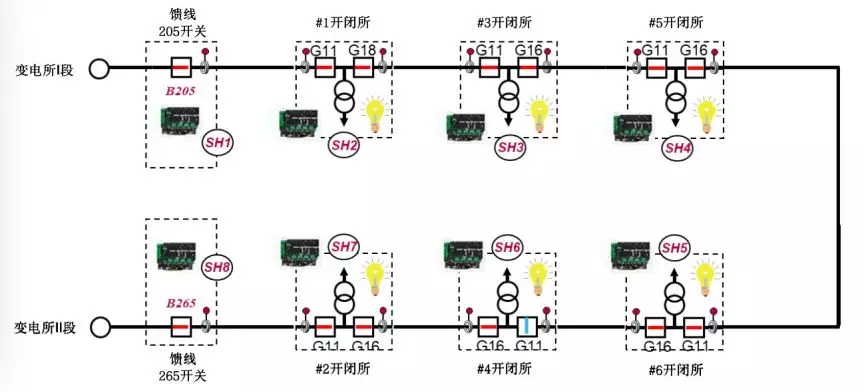 而通過(guò)在環(huán)網(wǎng)進(jìn)線負(fù)荷開(kāi)關(guān)柜布置T300的自愈方式,將能夠?qū)崿F(xiàn)更低成本的環(huán)網(wǎng)自愈。具體而言,在機(jī)場(chǎng)飛行區(qū)供電網(wǎng)絡(luò)建設(shè)中,變電站兩路出線帶若干個(gè)開(kāi)閉所組成一個(gè)環(huán),變電站外出線隔離站及每個(gè)環(huán)網(wǎng)站節(jié)點(diǎn)各配置一臺(tái)T300裝置,以對(duì)等通訊方式實(shí)現(xiàn)“故障區(qū)段自動(dòng)定位”、“故障區(qū)段自動(dòng)隔離”、“非故障區(qū)段自動(dòng)恢復(fù)供電”,使供電網(wǎng)絡(luò)故障實(shí)現(xiàn)全自動(dòng)化快速處理,約30秒內(nèi)實(shí)現(xiàn)故障的快速切除以及恢復(fù)送電,達(dá)到世界一流的配電自動(dòng)化水平。
